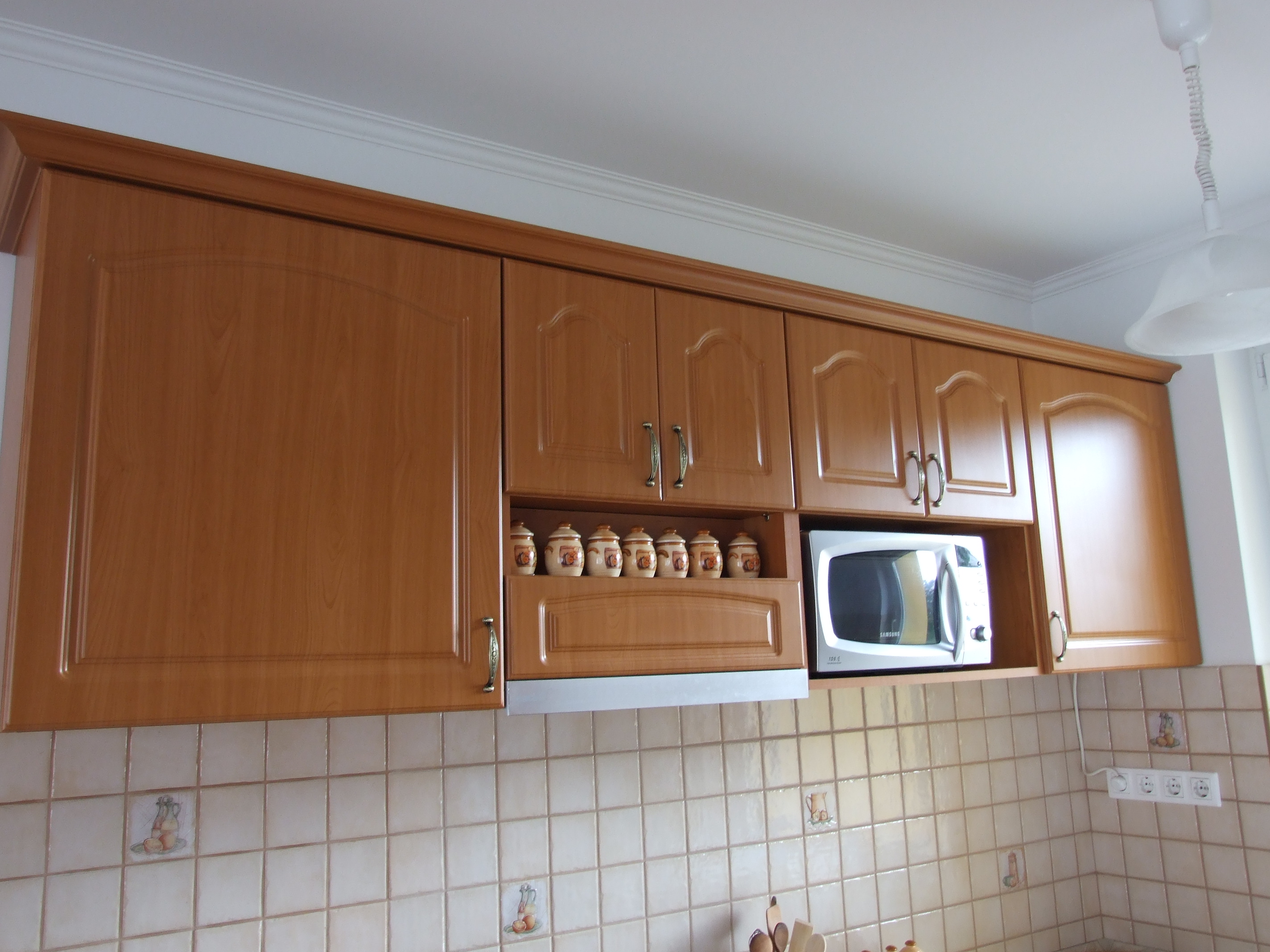 sötét barna korpuszú "U" alakú konyhabútor, pácolt és lakkozott fenyő ajtókkal, csempézett pulttal,
